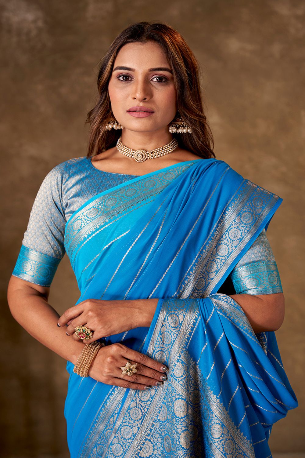 Discover elegance redefined with our exquisite collection of Georgette Silk Sarees. Crafted with precision and adorned with timeless designs, our sarees epitomize grace and sophistication. Elevate your style with the luxurious feel and captivating allure of Georgette Silk.