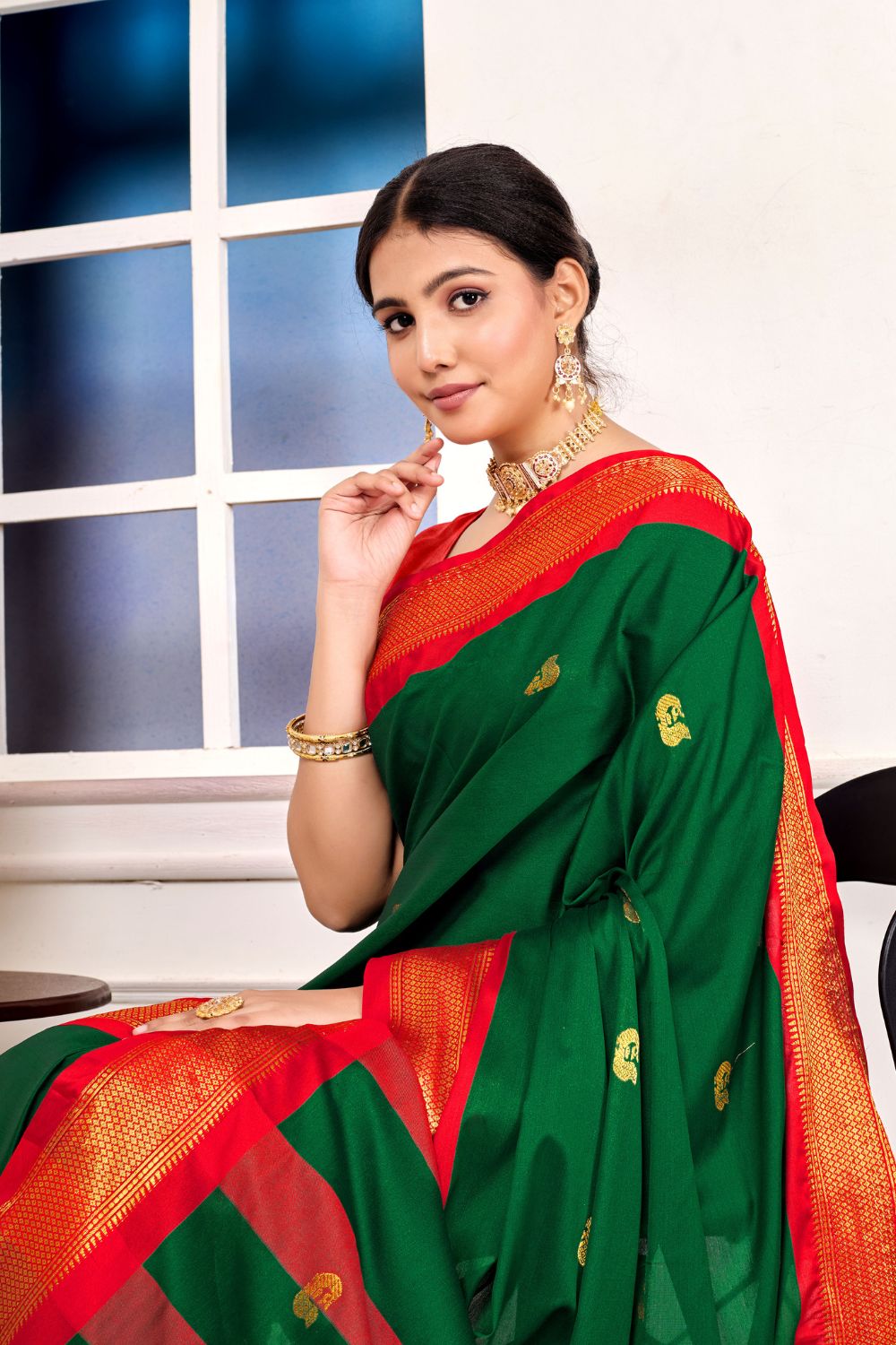 - Green & Red Royal Paithni Cotton Silk Gold Weaving Border