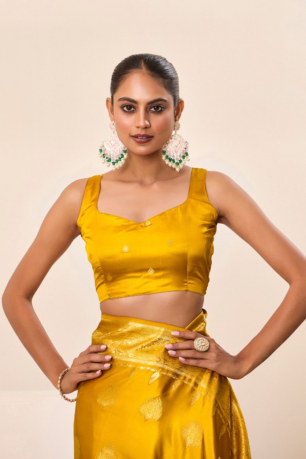 The blouse worn by the model might be for modelling purpose only. Check the image of the blouse piece to understand how the actual blouse piece looks like.