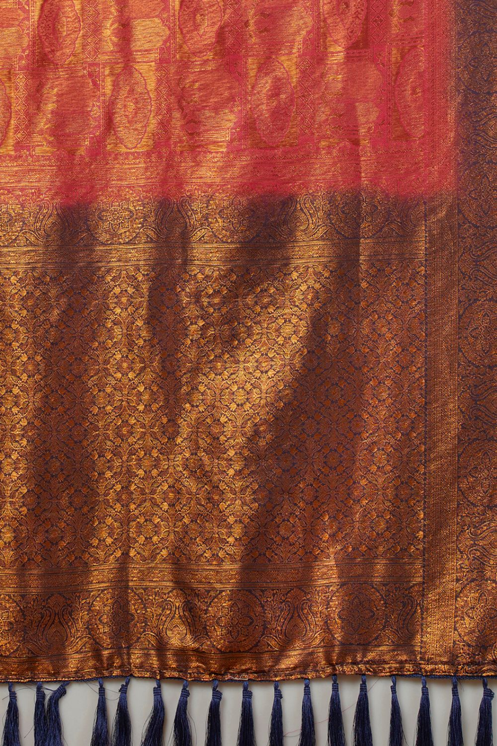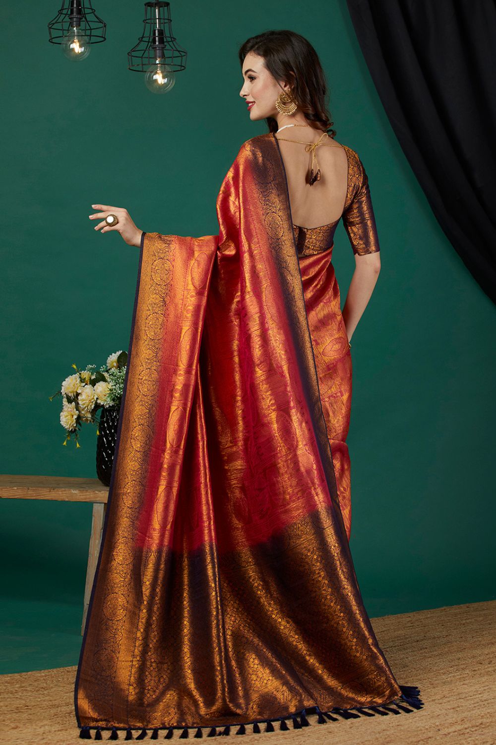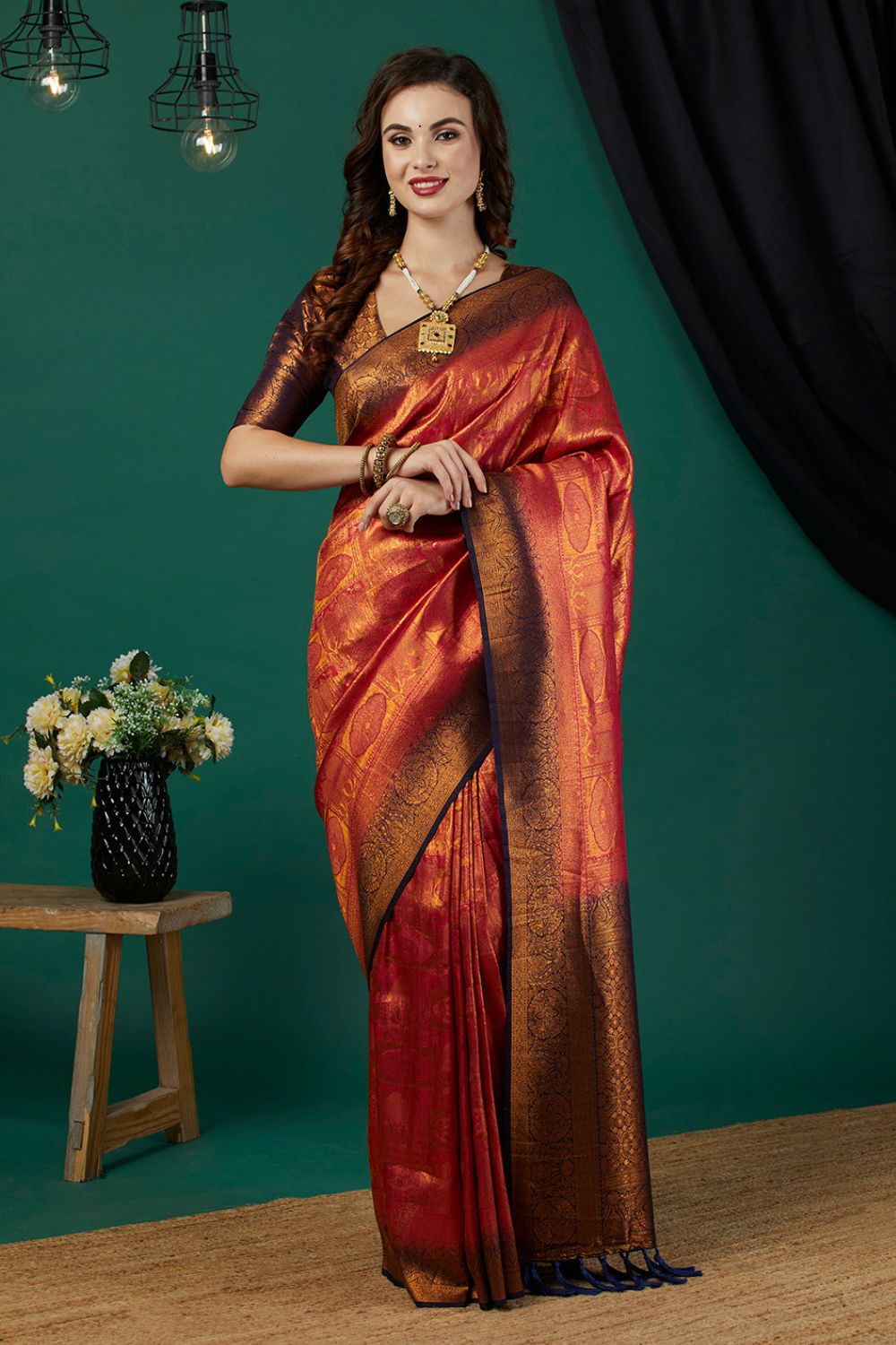 The model is wearing a stitched version of the blouse piece. The saree comes with an unstitched blouse piece