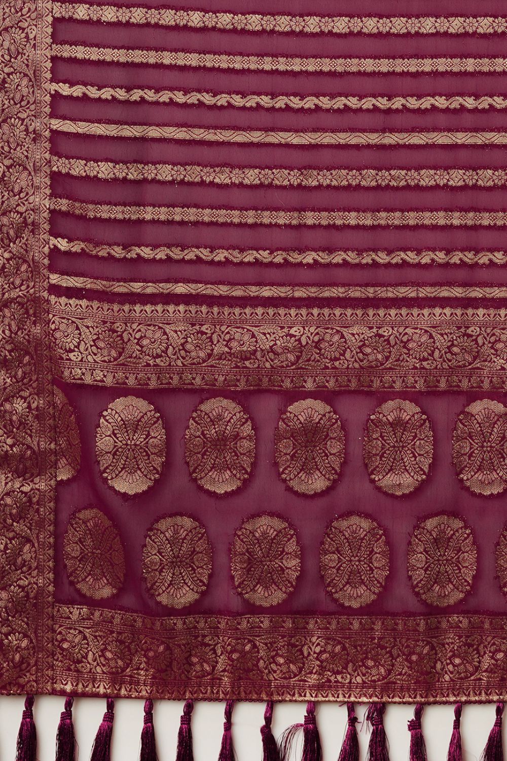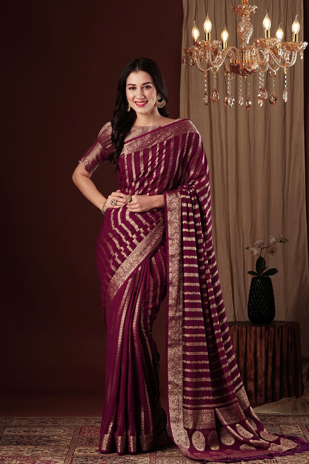 This elegant saree is crafted from pure georgette, showcasing exquisite gold zari work that adds a royal touch. The lightweight fabric drapes beautifully, offering comfort and grace. Ideal for festive occasions, weddings, and celebrations, this saree blends timeless tradition with modern sophistication for a truly stunning look.