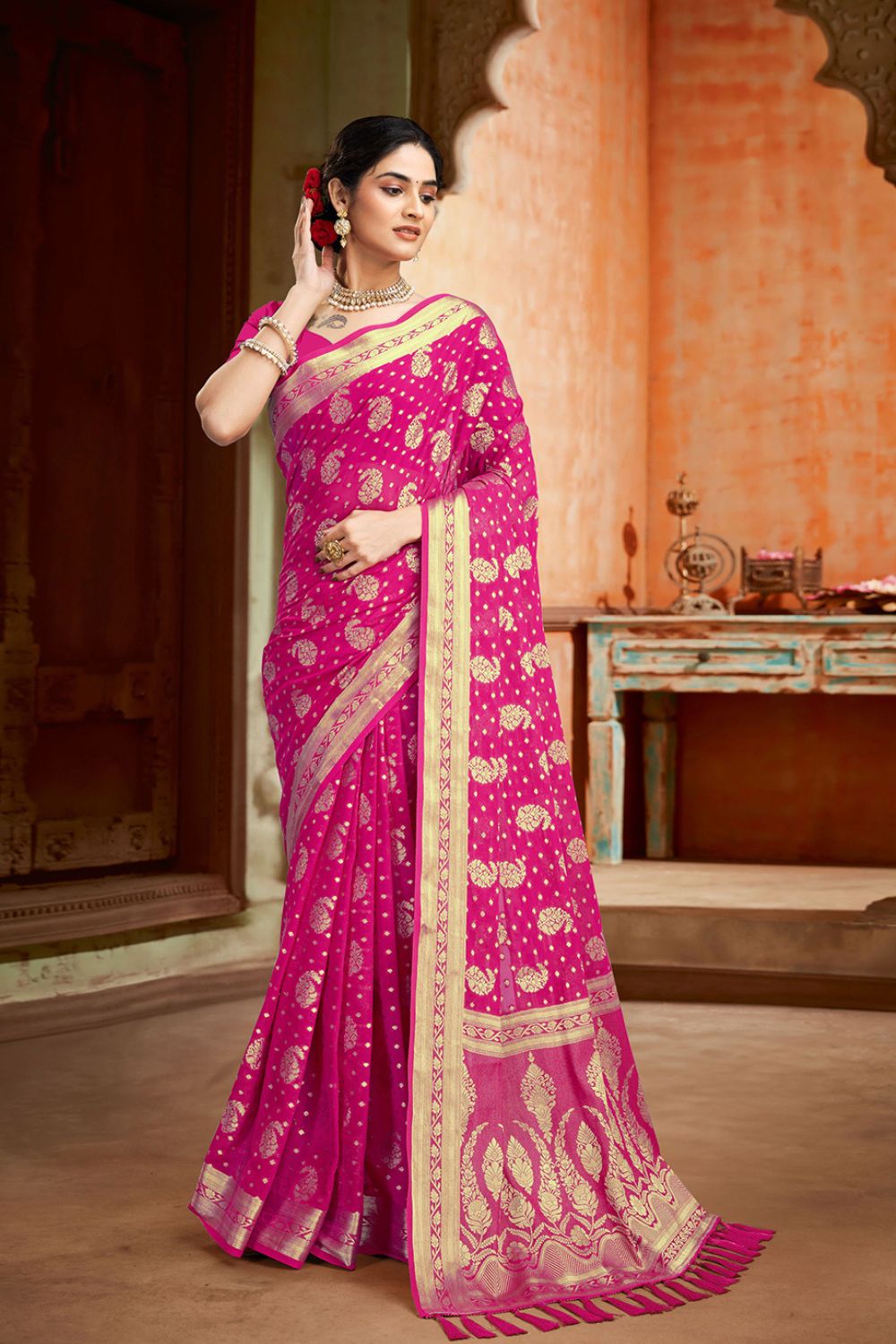 Discover elegance redefined with our exquisite collection of Georgette Silk Sarees. Crafted with precision and adorned with timeless designs, our sarees epitomize grace and sophistication. Elevate your style with the luxurious feel and captivating allure of Georgette Silk.