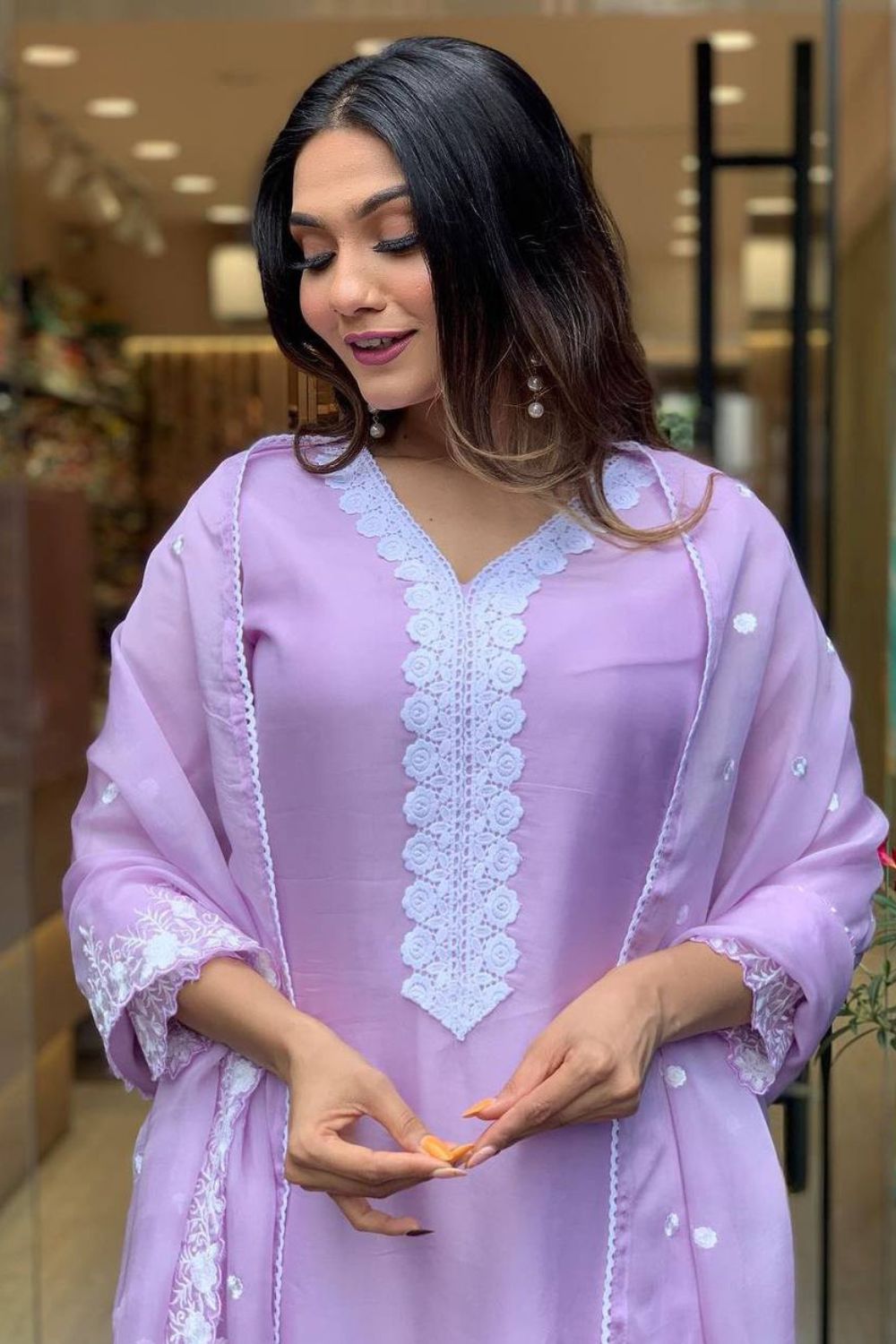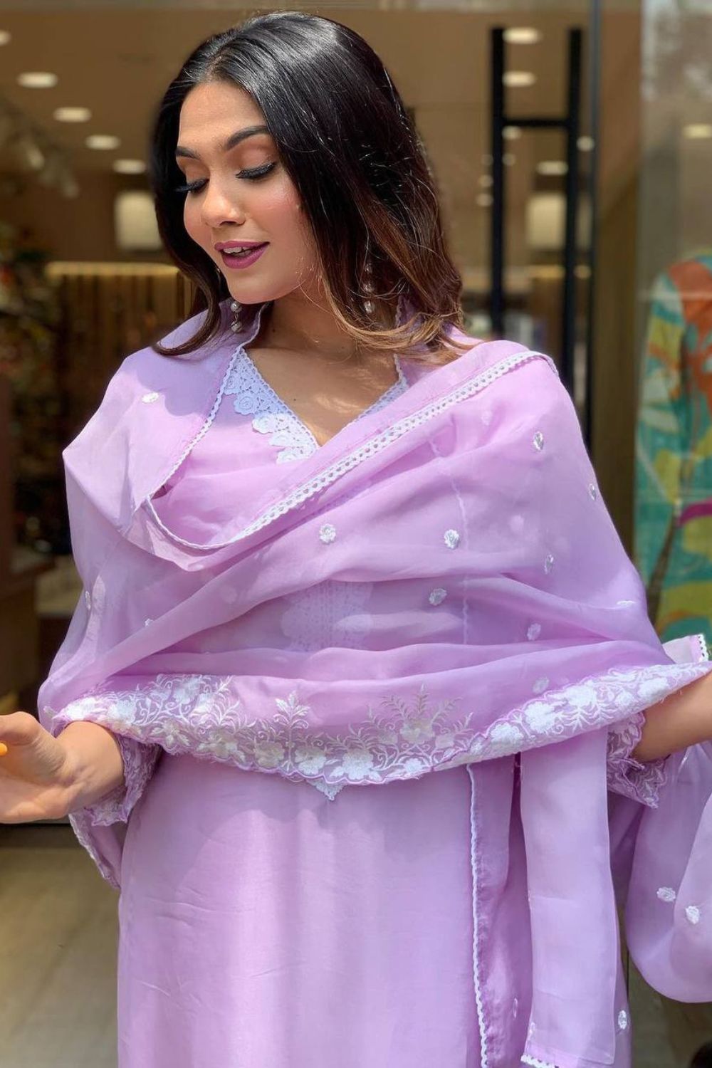 Purple Georgette Pure Russian Embroidered Silk Kurta Set