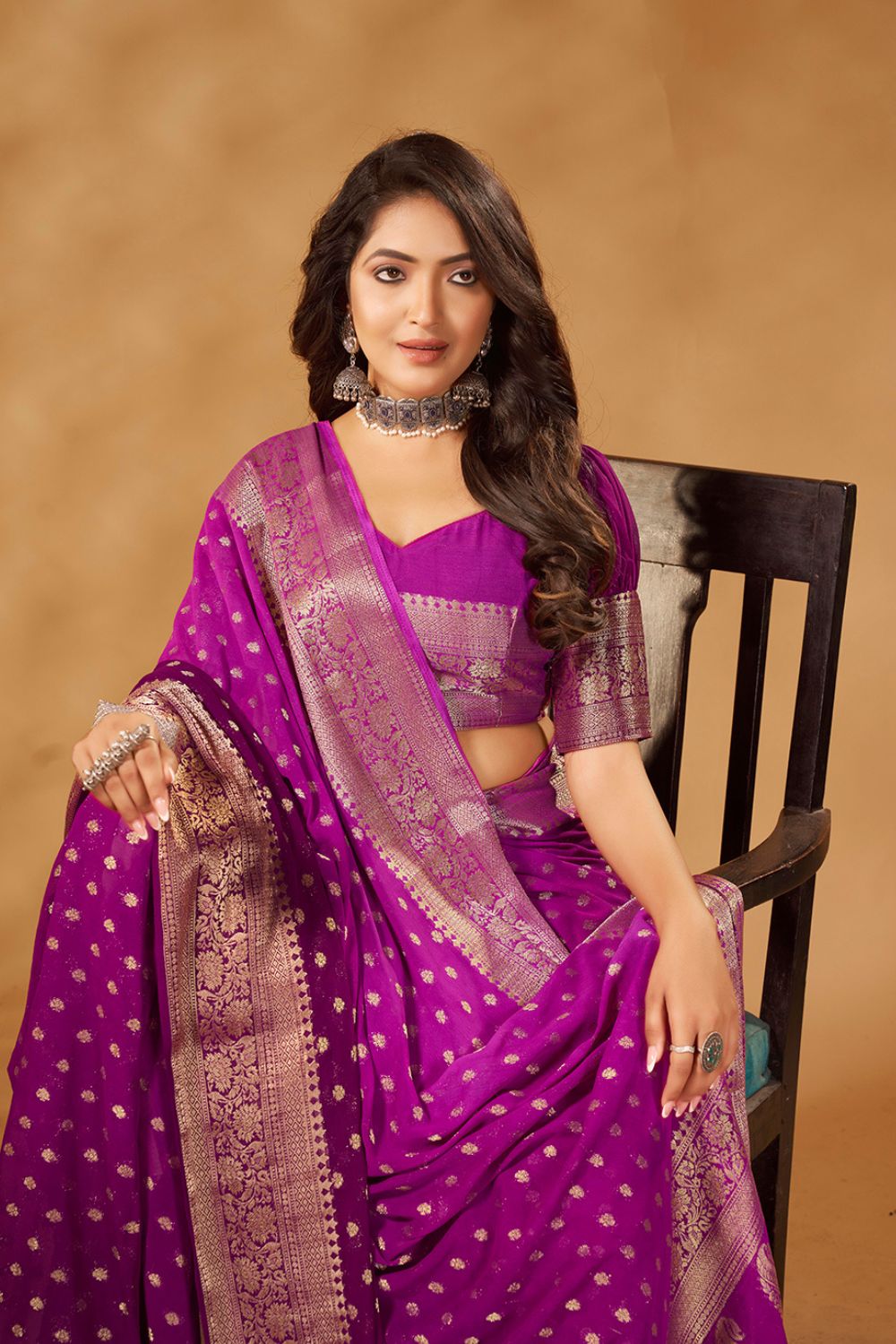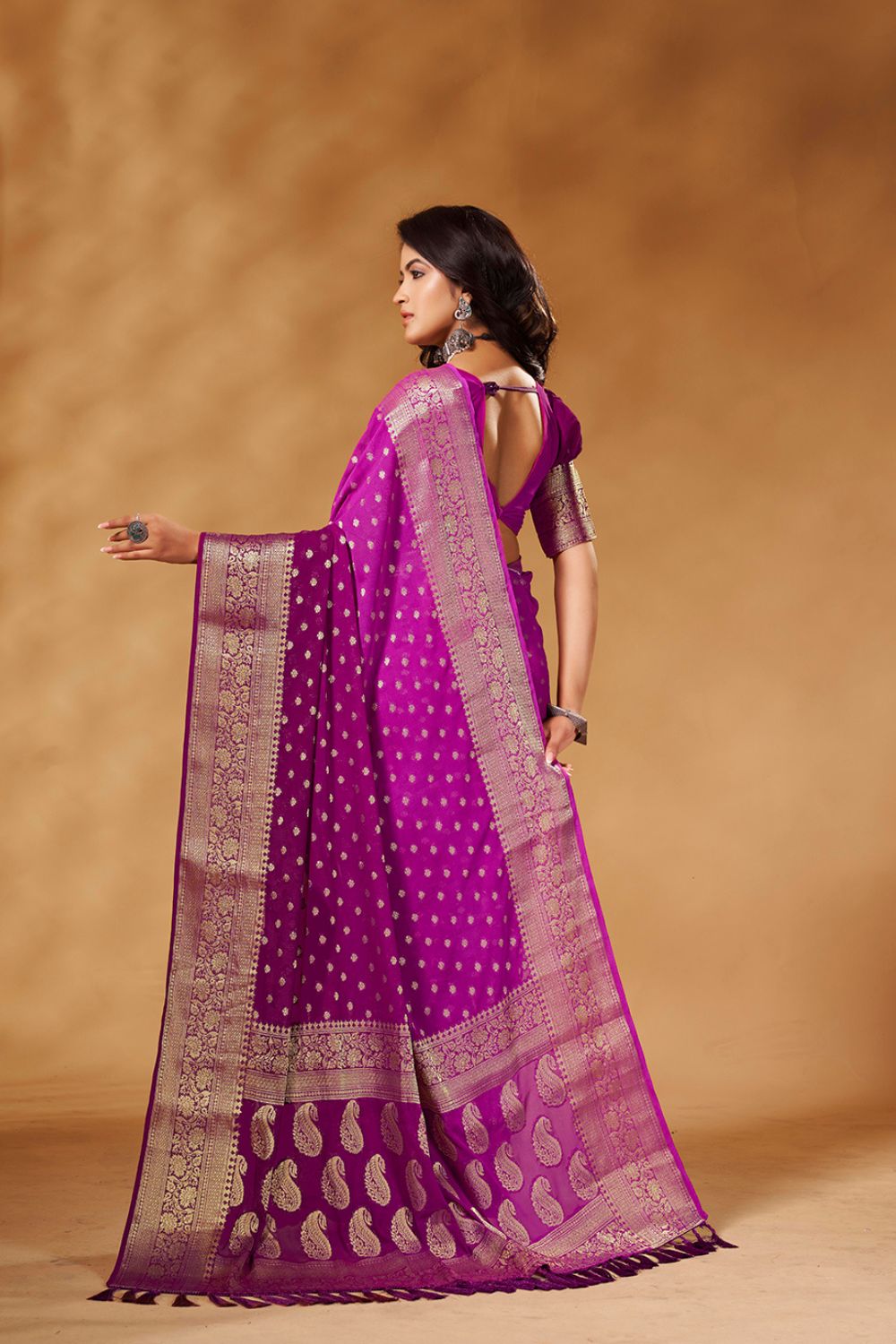 Discover elegance redefined with our exquisite collection of Georgette Silk Sarees. Crafted with precision and adorned with timeless designs, our sarees epitomize grace and sophistication. Elevate your style with the luxurious feel and captivating allure of Georgette Silk.