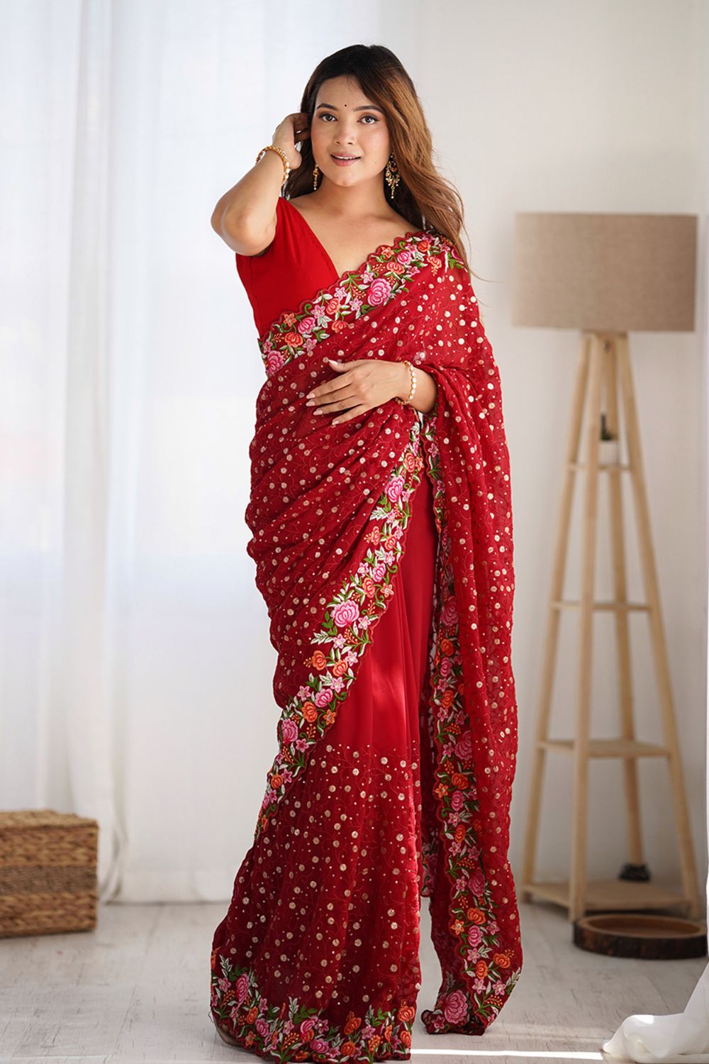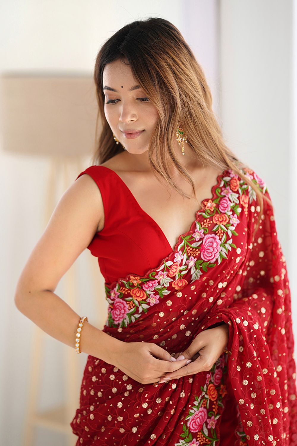 • Pure georgette silk saree having beautiful flowers work and cutwork of matching thread work