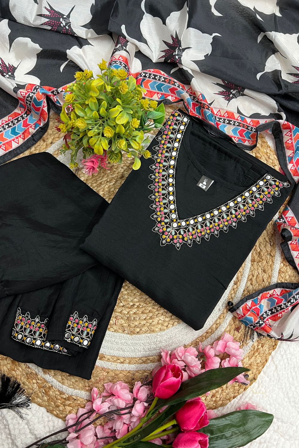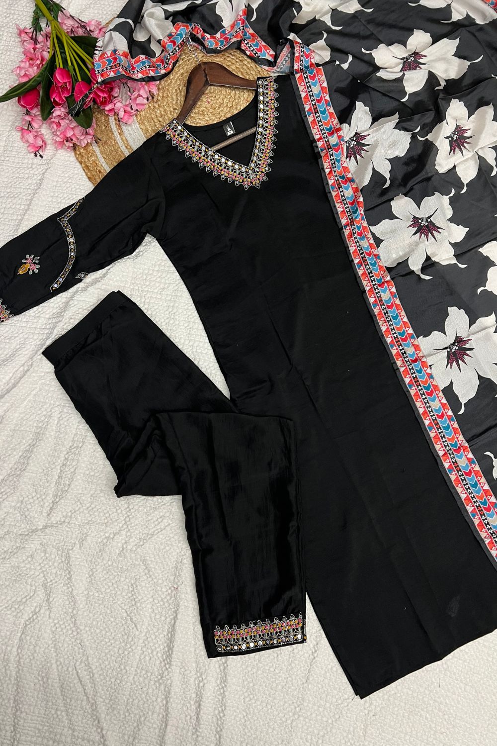 Black Viscose Chinon Embroidery Silk Kurta Set
