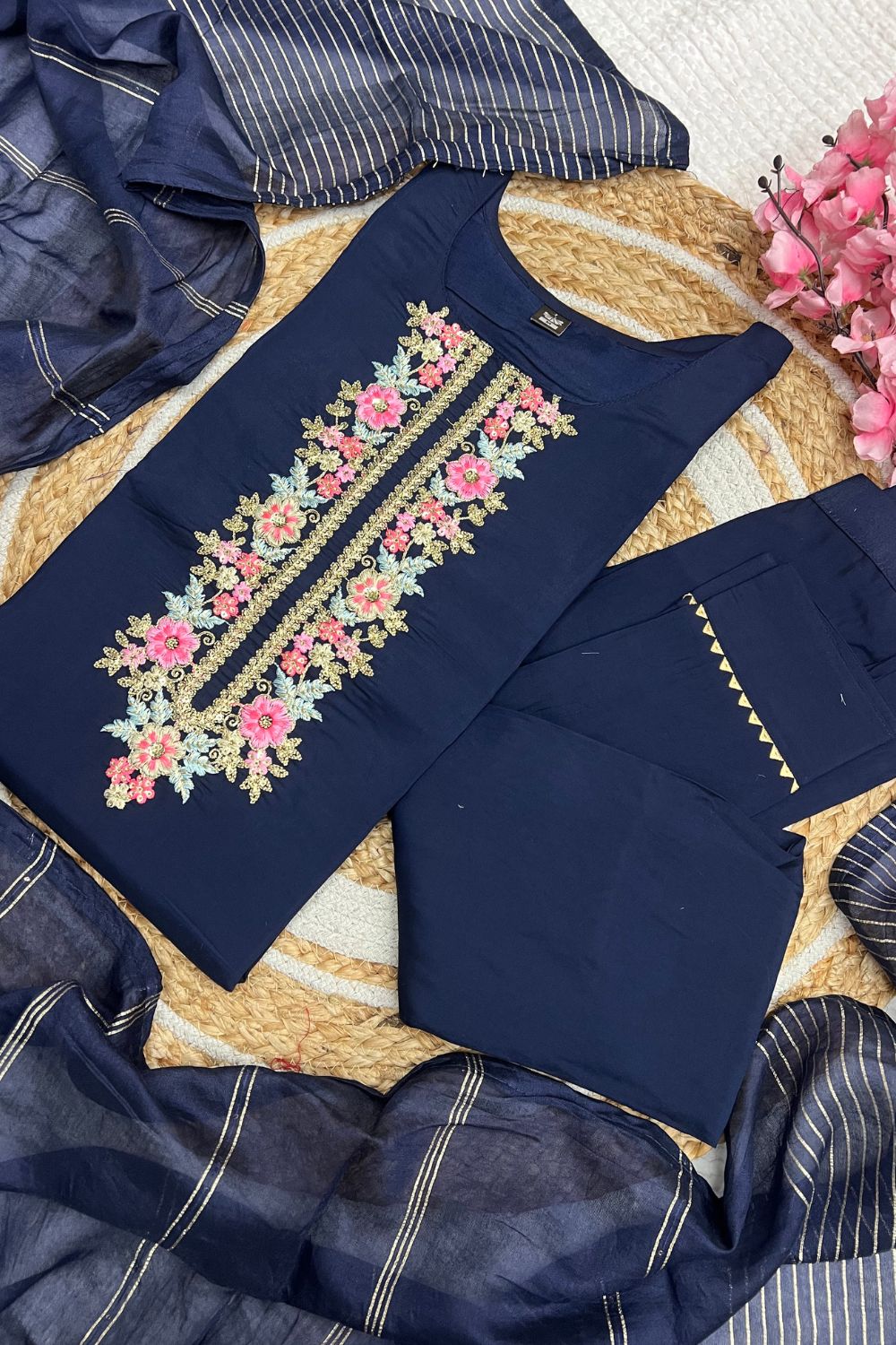 Navy Blue Viscose Chanderi Jacquard Embroidery Kurta Set