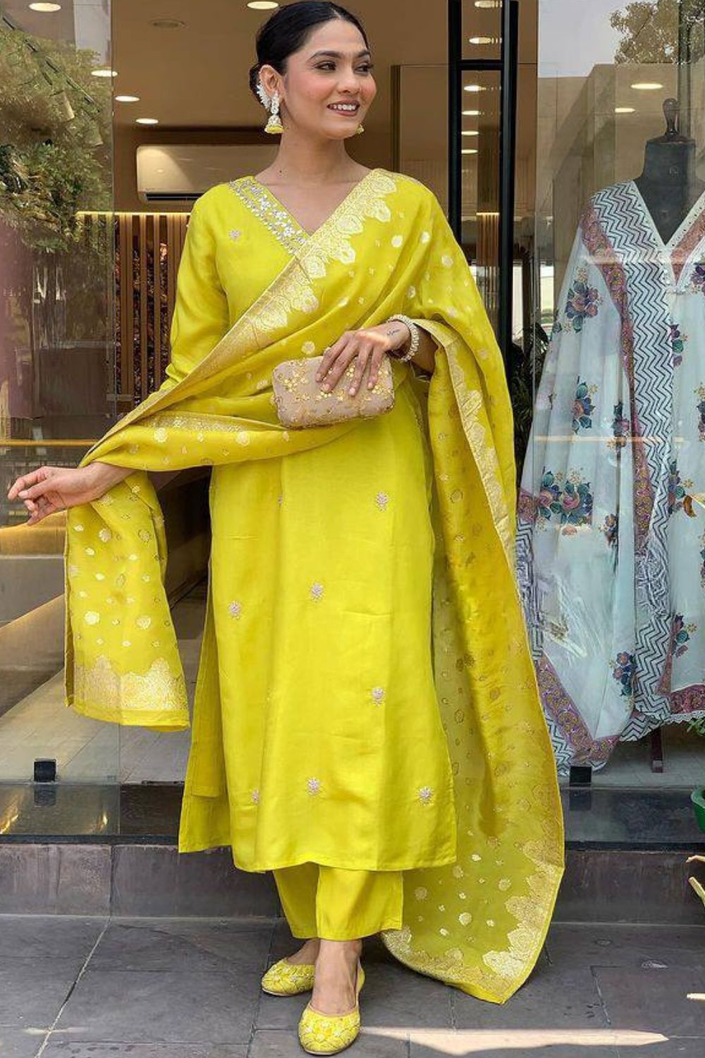 Yellow Viscose Chanderi Jacquard Embroidery Kurta Set
