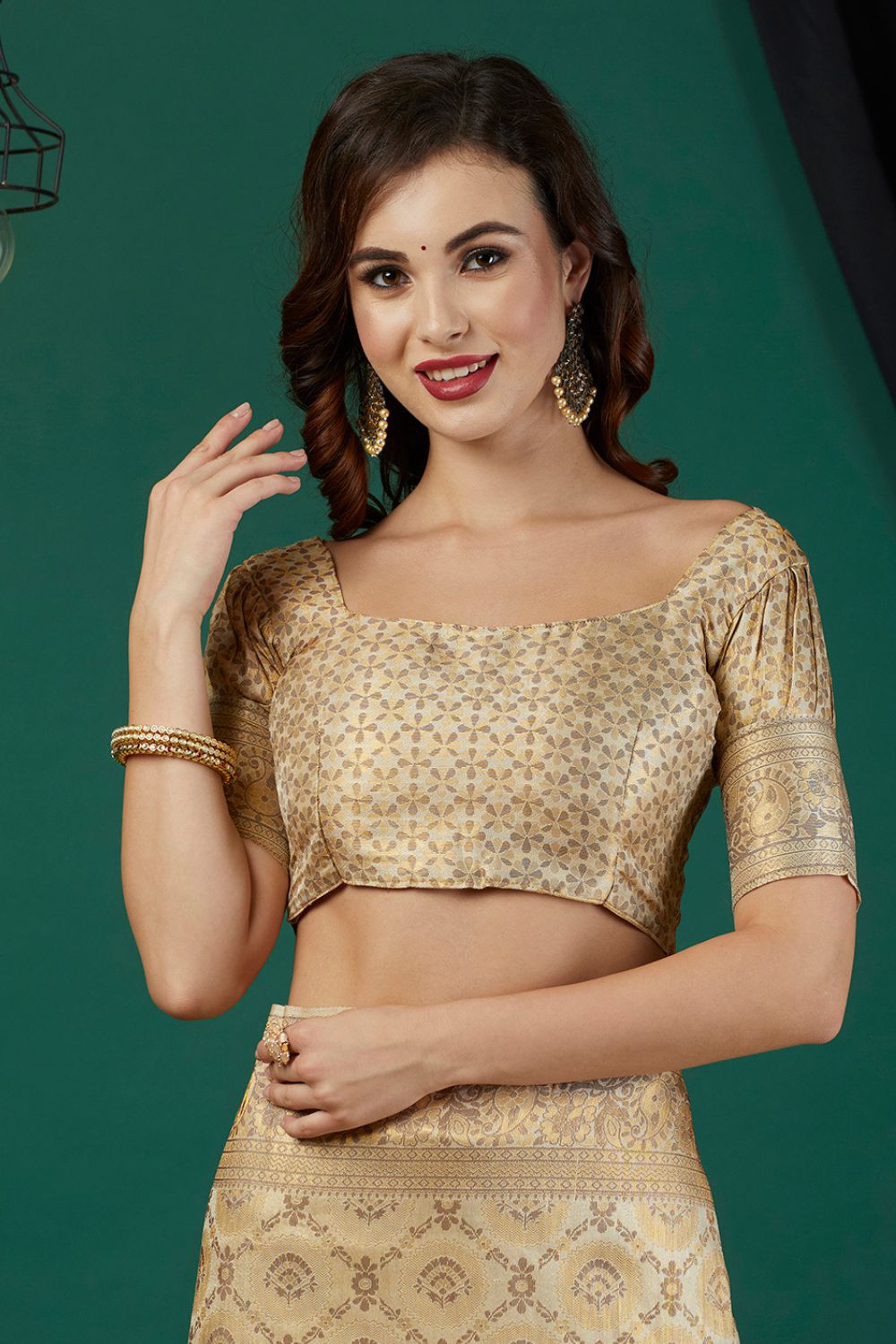 The blouse worn by the model might be for modelling purpose only. Check the image of the blouse piece to understand how the actual blouse piece looks like.
