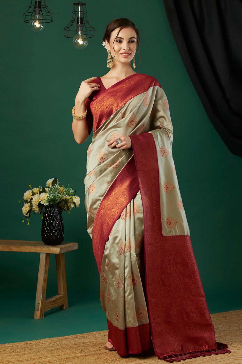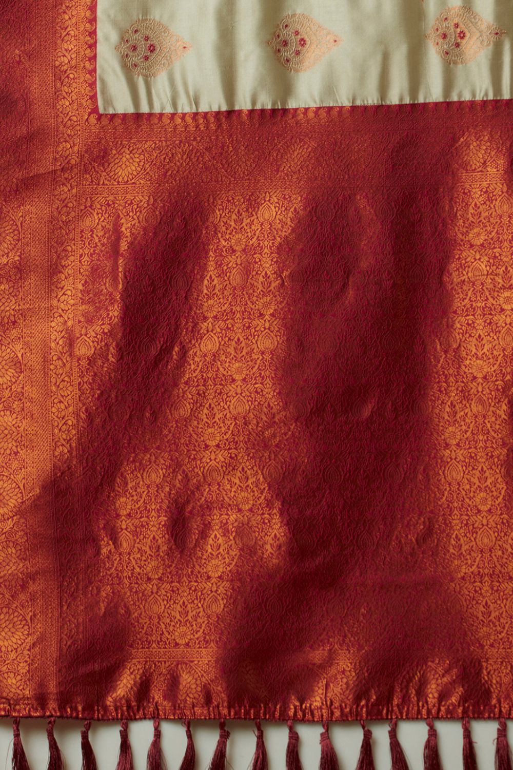 - Border & Pallu: Rich Maroon with intricate zari weaving