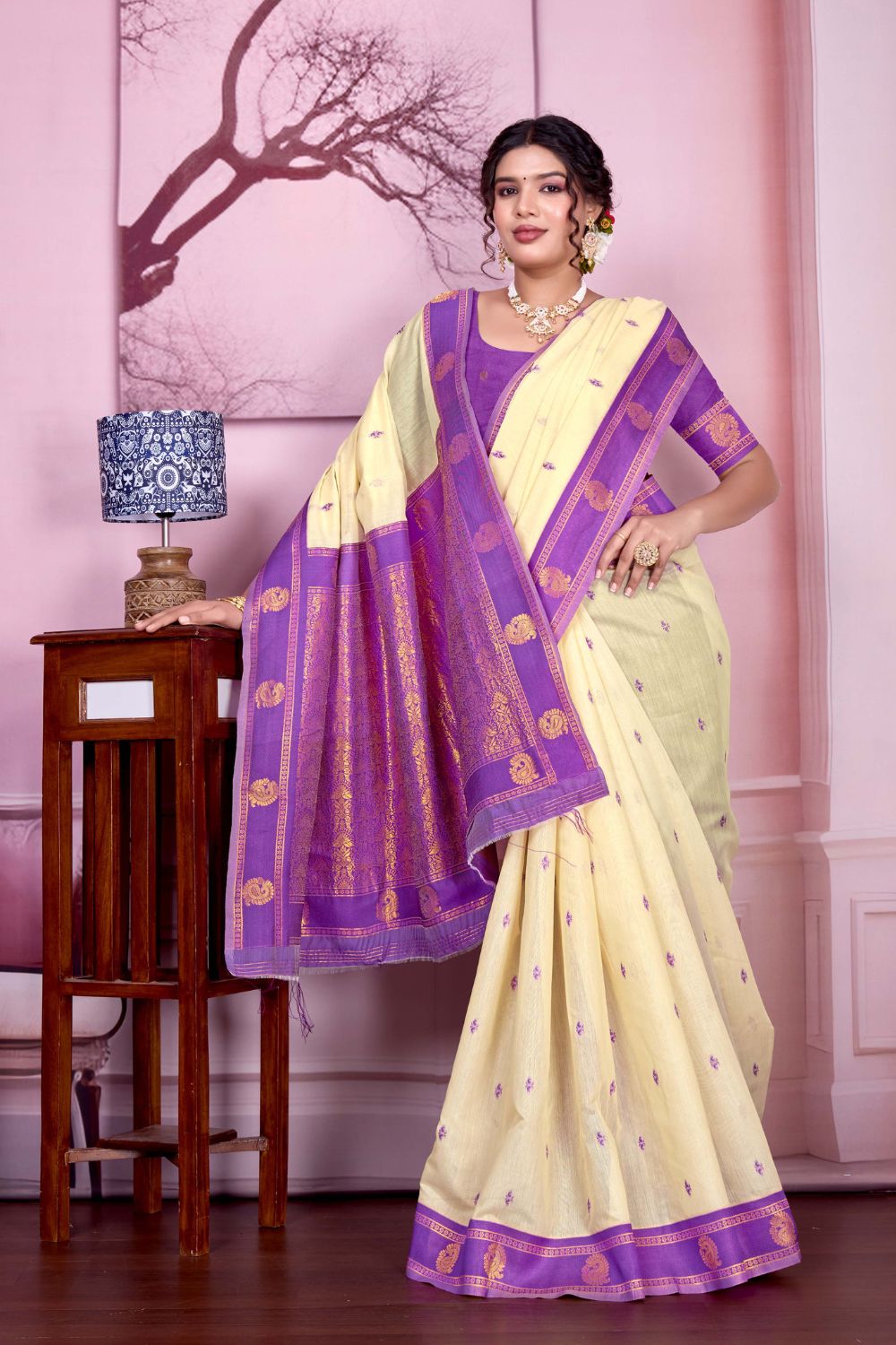 Cream Pure Handloom Cotton With Gold Zari Silk Saree