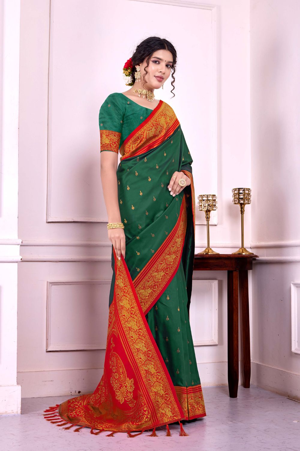 With Rich Pallu And Contrast Blouse. Check the image of the blouse piece to understand how the actual blouse piece looks like.