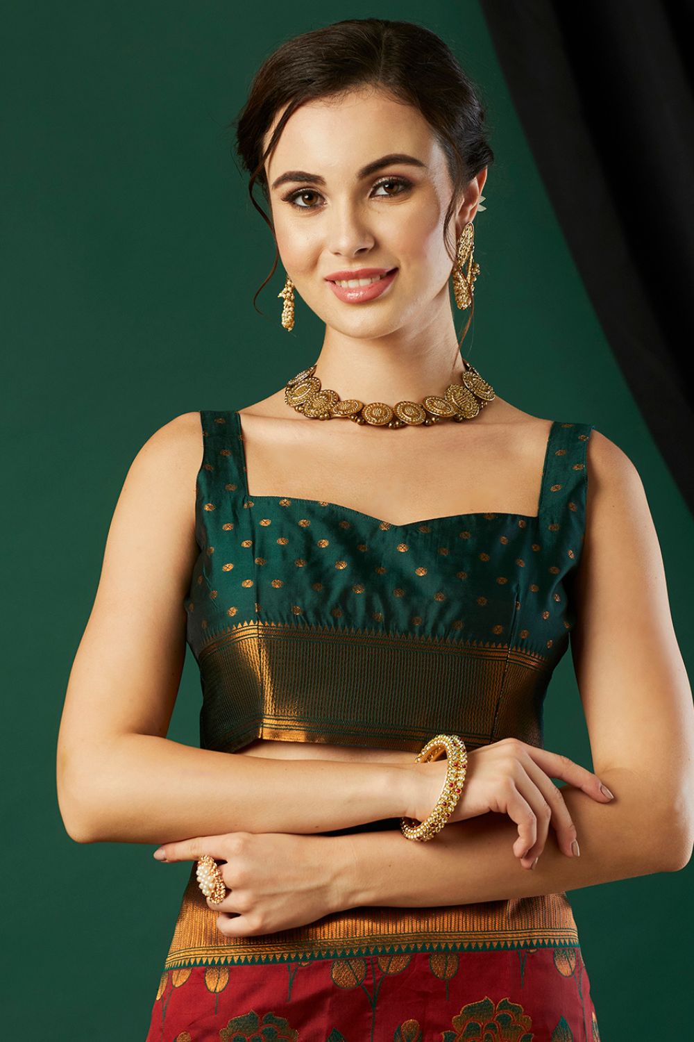 The blouse worn by the model might be for modelling purpose only. Check the image of the blouse piece to understand how the actual blouse piece looks like.