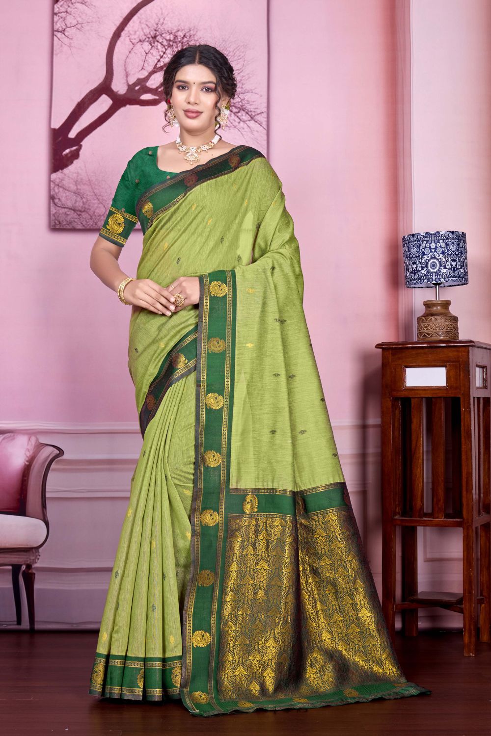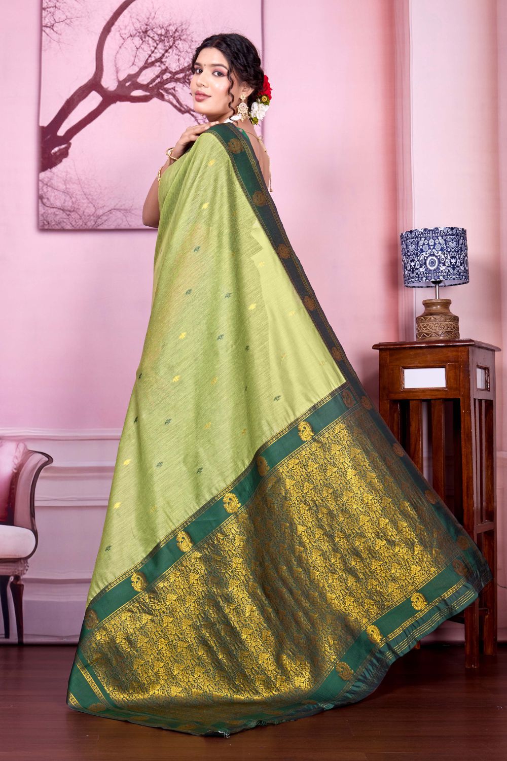 Olive Green Pure Handloom Cotton With Gold Zari Silk Saree