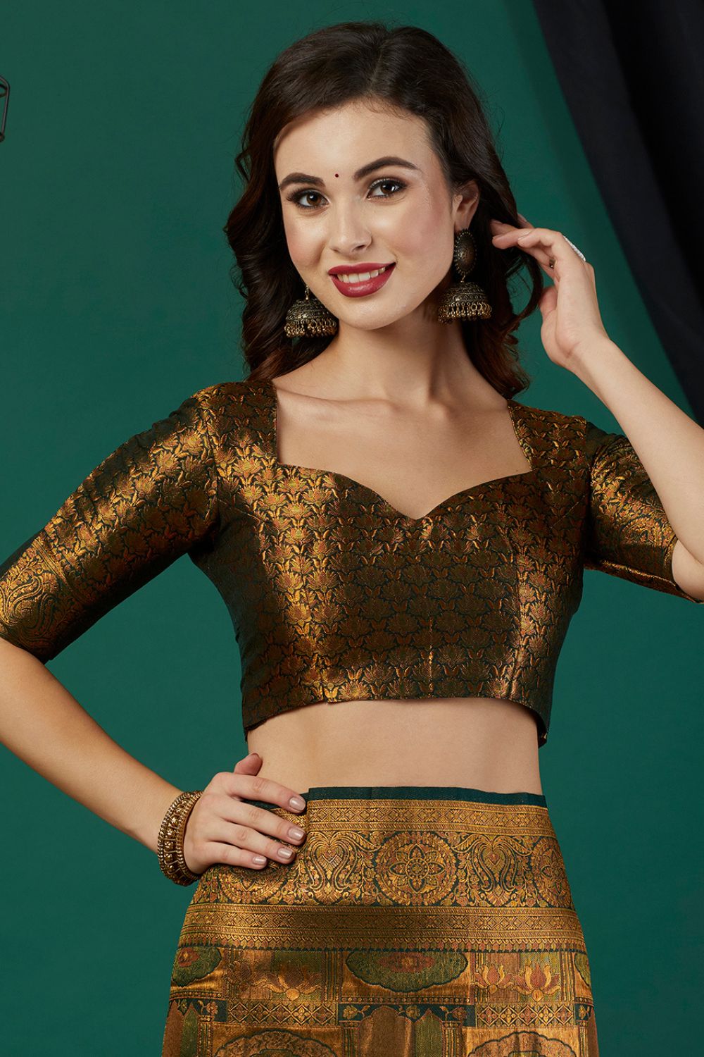 The model is wearing a stitched version of the blouse piece. The saree comes with an unstitched blouse piece