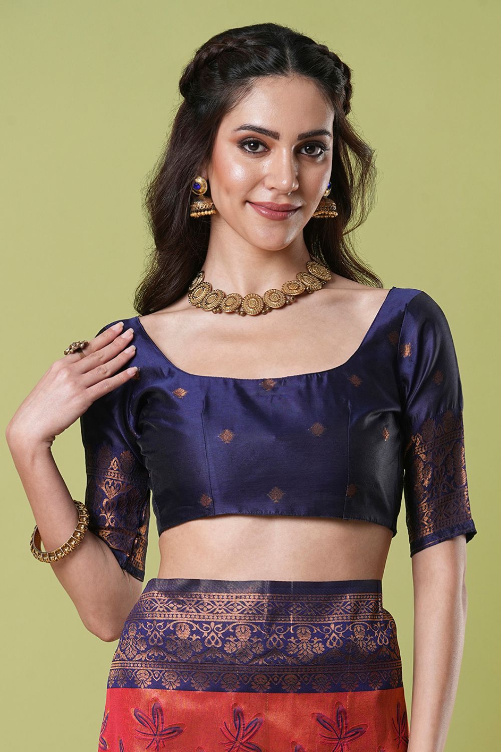 The blouse worn by the model might be for modelling purpose only. Check the image of the blouse piece to understand how the actual blouse piece looks like.