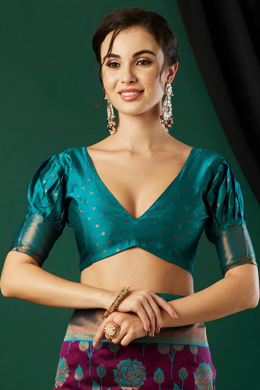 The blouse worn by the model might be for modelling purpose only. Check the image of the blouse piece to understand how the actual blouse piece looks like.