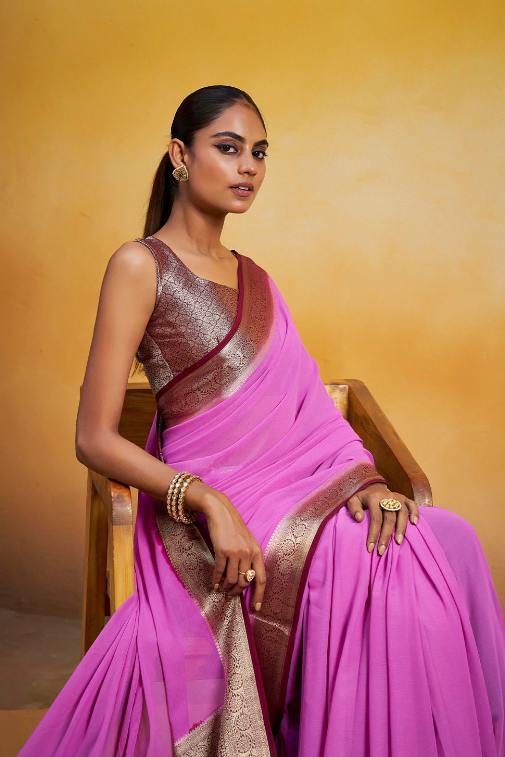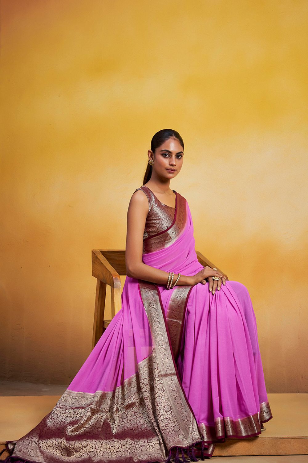 Discover elegance redefined with our exquisite collection of Georgette Silk Sarees. Crafted with precision and adorned with timeless designs, our sarees epitomize grace and sophistication. Elevate your style with the luxurious feel and captivating allure of Georgette Silk.
